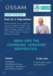 Üsküdar Üniversitesi Stratejik Araştırmalar Uygulama ve Araştırma Merkezi – ÜSSAM[1], 15 Ekim 2025 Çarşamba günü, üniversitenin Güney Kampüsü’nde, Hindistanlı ünlü bir sosyal bilimci olan Prof. Dr. C. Raja Mohan’ın konuşmacı olarak katıldığı “India and the Changing Eurasian Geopolitics” (Hindistan ve Değişen Avrasya Jeopolitiği) adlı akademik etkinliği düzenledi. Bu yazıda, bu etkinlikte Prof. Dr. Mohan tarafından dile getirilen bazı önemli görüşler özetlenecektir.