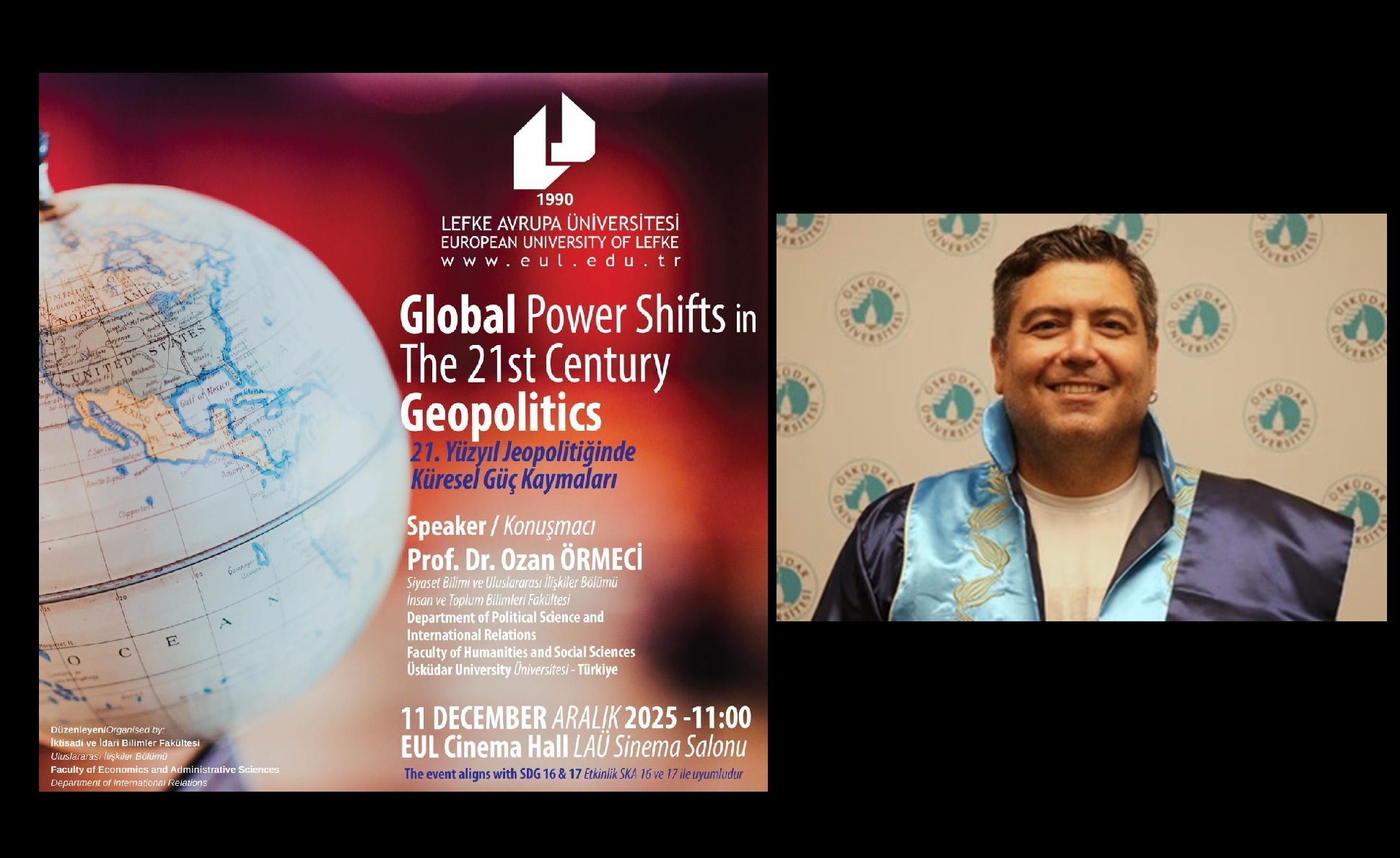 Üsküdar Üniversitesi öğretim üyesi ve Uluslararası Politika Akademisi (UPA) Genel Koordinatörü Prof. Dr. Ozan Örmeci, 11 Aralık 2025 tarihinde KKTC-Kuzey Kıbrıs’ta Lefke Avrupa Üniversitesi’nde düzenlenen özel bir konferansa konuk oldu ve “Global Power Shifts in the 21st Century Geopolitics” adlı sunumunu gerçekleştirdi. Aşağıda, bu konferanstaki sunuma ve bazı fotoğraflara ulaşabilirsiniz.