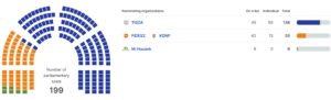 Henüz kesinleşmeyen seçim sonuçlarına göre, muhalefet bu defa başarılı bir performans sergileyerek Başbakan Orban ve partisi Fidesz’i geçmeyi başardı. Öyle ki, Peter Magyar liderliğindeki TISZA, Orban’ın partisi Fidesz’e yüzde 53’e yüzde 38,4’lük büyük bir üstünlük sağlayarak parlamentoda üçte ikilik çoğunluğu almayı başardı. Valasztas.hu internet sitesinin projeksiyonuna göre, bu sonuçlara göre TISZA Macaristan parlamentosunda 138 milletvekilliği alırken, Fidesz-KDNP ittifakı ancak 55 milletvekilliği ile yetinecek. Aşırı sağcı Mi Hazánk (Vatan Hareketimiz) ise yüzde 5,83 civarında oyla 6 meclis sandalyesi elde edecek. Bu şekilde 199 sandalyeli Macaristan Parlamentosu’nun yeni üyeleri de belirlenmiş ve Macaristan’da iktidar barışçıl bir şekilde el değiştirmiş oldu. Viktor Orban, seçim gecesi yaptığı konuşmada yenilgiyi kabul etti ve rakibini kutladı.